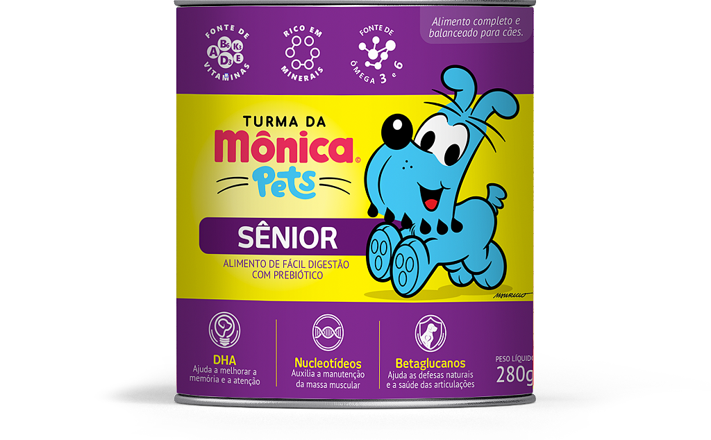 Proporcione ao seu melhor amigo momentos de saúde e vitalidade com a ração úmida Turma da Mônica - Lata Funcional Sênior. Especialmente formulada para cães seniores, essa deliciosa refeição de 280g é rica em nutrientes essenciais, garantindo uma dieta equilibrada e saborosa. Com uma combinação única de DHA, nucleotídeos e betaglucanos, este alimento promove a saúde cognitiva, auxilia na manutenção da massa muscular e fortalece as defesas naturais do seu pet.