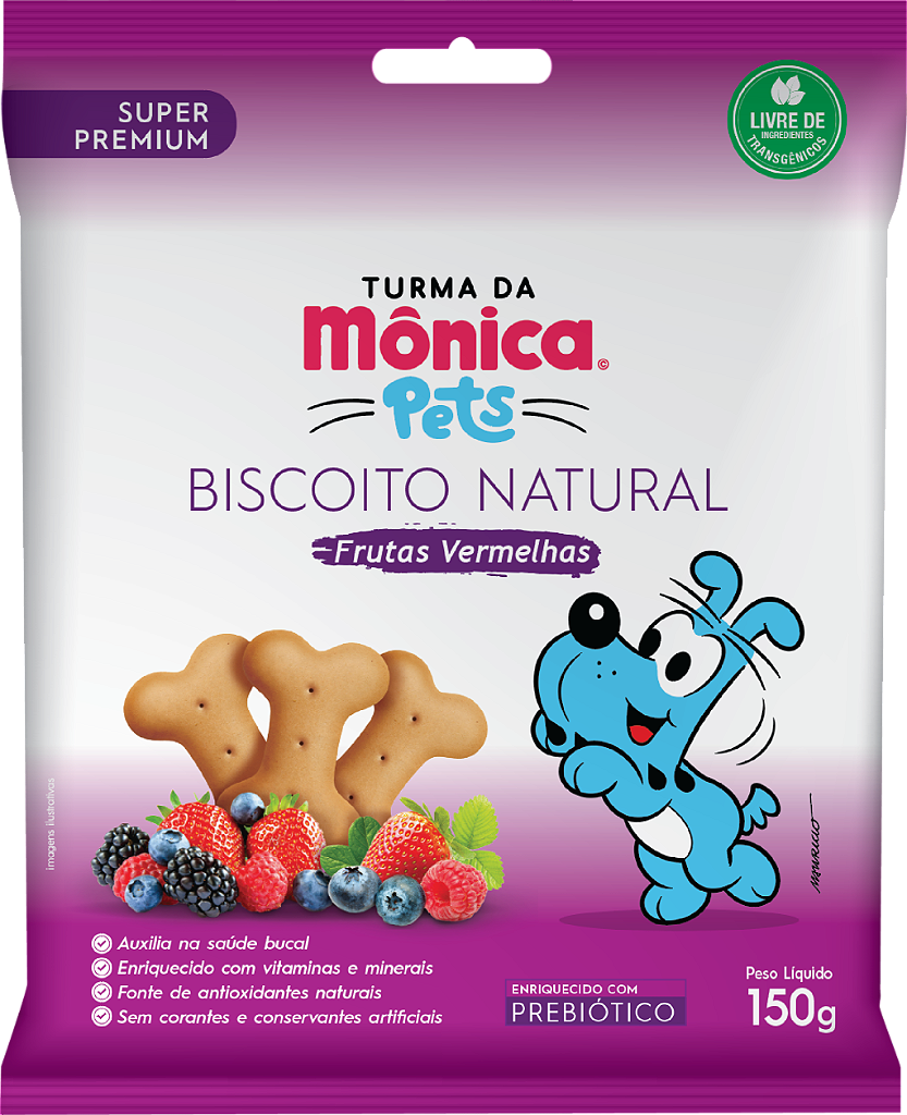 O biscoito natural Frutas Vermelhas 150G Turma da Mônica ,é específico para cães, de todas as raças,foram desenvolvidos por especialista em nutrição e elaborados com ingredientes selecionados e funcionais,Promovem o bem estar,auxiliam na prevenção de tártaro e proporcionam beneficios nutricionais importantes para os cães,são crocantes, muito saborosos,livres de transgênicos,concervantes artificiais e corantes.alem de enriquecidos com vitaminas e minerais.